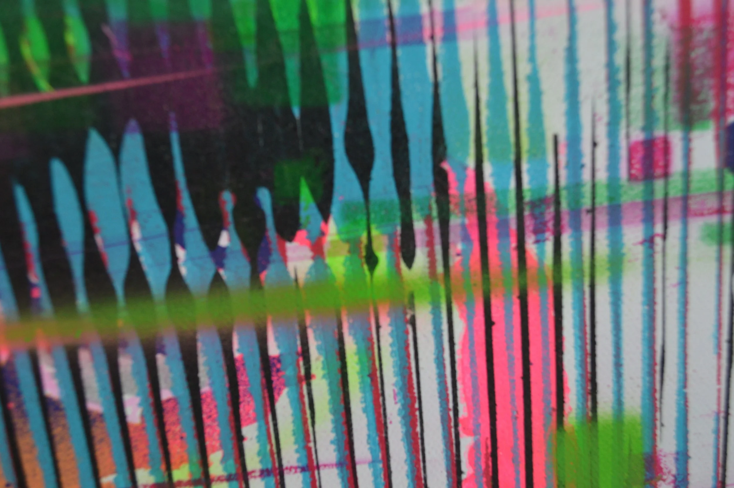 The use of vibrant colors and bold lines, combined with the distorted and fragmented imagery of digital glitches, serves to remind us of the ways in which our perceptions are shaped by the screens we look at every day.